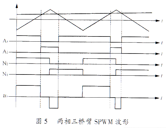 采用SPWM控制时,由N1及N2构成的公共桥臂要同时接入电机的两相绕组中,所以在调制时,公共桥臂的调制波就不同于A及B桥臂的调制波。