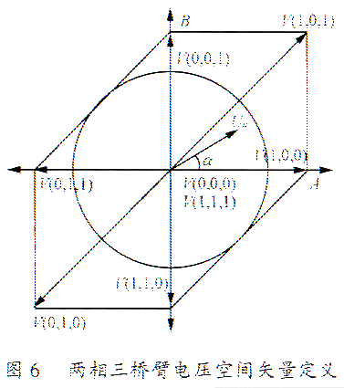 8支矢量中,两个零矢量位于坐标原点,其余6支根据绕组轴线以图6所示方式分布。电压空间矢量都可以由与之相邻的两个基本矢量和零矢量组合而成。矢量V(1,0,1)和V(0,1,0)在矢量合成时可有可无。为了计算的方便,只使用4只位于坐标轴上矢量和两只零矢量来合成电压空间矢量。(10)