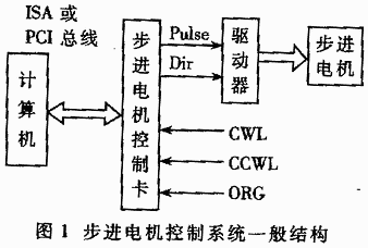 步进电机在数控机床、医疗器械、仪器仪表等自动或半自动设备中得到了广泛应用。用计算机控制步进电机的通常作法是采用步进控制卡,系统构成如图1所示。其中Pulse、Dir分别为控制电机的转换步数和旋转方向的信号;CWL(Clock Wise Limit)、CCWL(Counter Clock Wise Limit)分别为电机顺、逆时针旋转的限位信号;ORG为定位信号。