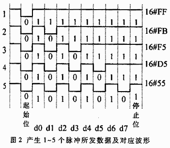 在串行口发送数据的过程中,串行口先发送起始位(逻辑0)进行同步,接着按规定的波特率(B)从低位到高位依次发送通讯数据的各二进制位,最后发送停止位(逻辑1)。表示每个二进制位的逻辑电平在TXD端的保持时间为1/B秒。如果按8位数据位、1位停止位、无奇偶校验方式发送数据,所发送数据的二进制位是0、1交替的。例如:数据取01010101(即16进制的16#55),其发送过程如图2中5所示,每发送一个字节,在TXD端发出5个脉冲,周期T=2/B,即频率f=B/2。改变发送数据的各二进制位,便可在TXD端得到不同的波形。图2示出欲产生1~5个脉冲时应发出的数据及对应的波形。