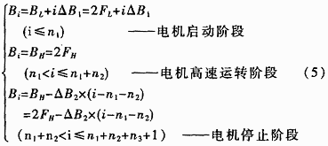 为避免电机失步和提高电机运行速度,将步进电机运行过程为分三个阶段:低速起动并加速、高速运行、减速并停止;相应地控制脉冲也分为:升频、高频、降频三段,如图4所示。