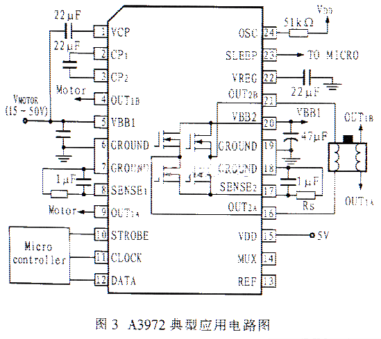 图3为A3972的典型应用电路图。从图中可以看出,只需要少量的外部元器件和几根控制线就可构成一个完整的微步距驱动二相步进电机电路。