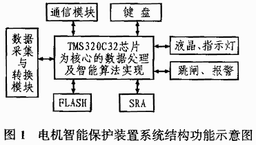 国内的电动机保护装置种类繁多,但随着现代大中型电动机对保护要求的不断提高和VLSI技术的不断进步,传统的基于热敏电阻、机械式继电器和电子式等保护模式均因可靠性不高,容易出现误操作等缺点已不能满足需要;而以单片机为核心的数字或保护装置的运算速度不高、资源有限、数据处理能力和可扩展性不好等问题日益突出。新的相关理论和技术(如小波变换、自适应保护、故障诊断、模糊整定等)的出现加速了高性能和综合型微机保护的发展,但这不仅要求更高性能的CPU(如近年飞速发展的系列DSP芯片)的支持,而且还要有与之相适应的外围存储器的支持。鉴于此,笔者在开发基于DSP的大中型智能电动机保护装置(系统结构功能如图1)时,在外扩存储器方面采用了AMD公司生产的Flash芯片Am29F010B。该Flash memory因容量大、体积小、功耗低、成本低等优点而被广泛应用于消费类电子、军事、航空航天等领域。