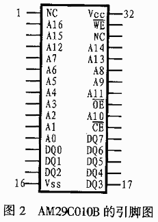 Am29F010B存储器采用PDIP,PLCC,TSOP封装,图2给出了Am29F010B的PDIP封装引脚图,各引脚的功能如下: