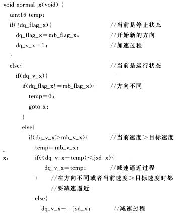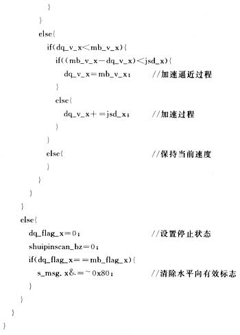 在运行控制方法采用了两级速度比较运行的方法。系统中存在两级速度:当前速度和目标速度。因为此系统是变速系统,在速度改变时要求系统必须平稳地过渡,此方法是:当系统收到变速指令时,首先将目标速度与当前速度相比较,并确定两速度之间的范围,以确定加速度的大小,若目标速度高于当前速度,则系统以较大的加速度加速运行,当接近目标速度时,系统减小加速度的值。逐渐靠近目标速度,直至相等,并以目标速度运行,直到再次收到变速指令。