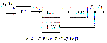 图1所示的控制环节可以很方便地用锁相环硬件电路来实现,其原理如图2所示。图中,PD为相差比较器,其传递函数为ud=kp%26;#183;△θ;VCO为压控振荡器,其传递函数为fVCO=(kvuc)/s.