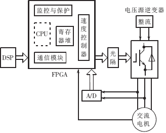 可靠性和实时性是对控制系统的基本要求,最初的电机控制都是采用分立元件的模拟电路。随着电子技术的进步,以脉宽调制(PWM)为基础的变频调速技术已广泛应用于电机控制中。在数字化趋势广泛流行的今天,集成电路甚至电机控制专用集成电路已大量应用在电机控制中。特别是最近几年兴起一种全新的设计思想,即基于现场可编程门阵列(FPGA)的硬件实现技术。该技术可以应用于基于矢量控制的异步电机变频调速系统中。FPGA本身是标准的单元阵列,没有一般的IC所具有的功能,但用户可以根据自己的需要,通过专门的布局布线工具对其内部进行编程,在最短的时间内设计出自己的专用集成电路,从而大大地提高了产品的竞争力。由于FPGA以纯硬件的方式进行并行处理,而且不占用CPU的资源,使系统可以达到很高的性能。这种设计方法应用于异步电机矢量控制变频调速系统时,一般把电流控制作为DSP 的协处理,转子速度和转子磁链算法由DSP 主机来实现。一般情况下,位置控制比较灵活,很难做到通用性,所以位置环节一般由DSP来完成,但速度控制和电流控制具有通用性,因此可以把它们集成到一个专用芯片中。这样,既可以实现速度控制,又可以对电流单独控制,还可以和DSP共同构成位置控制系统。如图1所示,若FPGA中集成有CPU内核,则可以把位置、速度、电流3种算法完全由1片FPGA来实现,从而实现真正的片上系统。
