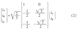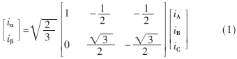 设异步电机三相绕组(A、B、C)与二相绕组(α、β)的轴线设定如图2所示,A相绕组轴线与α相绕组轴线重合,都是静止坐标,分别对应的交流电流为iA、iB、iC和iα、iβ。采用磁势分布和功率不变的绝对变换,三相交流电流在空间产生的磁势F与二相交流电流产生的磁势相等。即采用正交变换矩阵,则其正变换公式为: