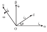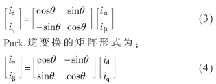 由二相静止坐标系(α,β)到二相旋转坐标系(d-q)的变换称为Park变换。α、β为静止坐标系,d-q为任意角速度ω旋转的旋转坐标系。当α、β静止坐标系变换为d-q旋转坐标系时,坐标轴的设定如图3所示。图3中θ为α轴与d轴之间的夹角,d、q绕组在空间垂直放置,加上直流id和iq,并让d、q坐标以同步转速ω旋转,则产生的磁动势与α-β坐标系等效。d-q和α-β轴的夹角θ是一个变量,随负载、转速而变化,在不同的时刻有不同的值。Park变换,写成矩阵形式,其公式如下: