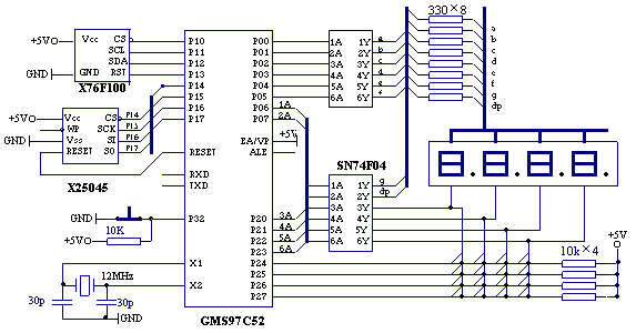 由于GMS97C52的驱动电流有限,在P0、P2口加反向器SN74F04,增加驱动能力。它的吸入电流为64mA,输出电流为15mA,可以保证位选所需的吸入电流。