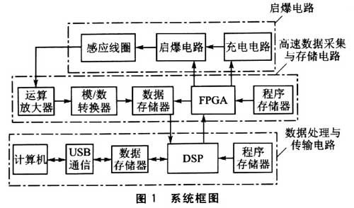 整个系统的组成如图l所示。当启爆电路在DSP和FPGA的控制下启爆时,感应线圈取出启爆电流,首先是高速数据采集与存储电路,以FPGA为核心,对数据进行高速采集与存储。数据存储完毕,FPGA发信号告知DSP采集完毕,开始对采集的数据进行相关的处理。DSP对信号处理的内容:首先对信号滤波,然后进行必要的时域和频域分析,提取相关的信号特征,包括持续时间、信号带宽、峰值、功率、能量等。处理完的数据通过USB口传送到计算机,继而进行专业的相关分析。这里如果采用高速DSP进行数据采集,对于DSP的运算能力是一种浪费。而在高速数据采集方面,FPGA有单片机和DSP无法比拟的优势。FPGA时钟频率高,内部时延小;全部控制逻辑由硬件完成,速度快,效率高.因此有图l所示的系统组成。
