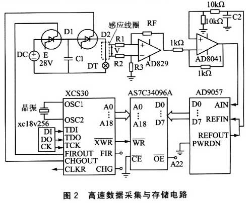 电火工品的启爆电流作用时间为μs级。XCS30是Xilinx公司基于SRAM技术的FPGA芯片,由它发出指令对电容Cl充电并启爆电火工品DT。非接触式感应线圈作为启爆电流的探测装置,取出电压。前端调理电路一是扩大可测信号的幅度范围,设置放大器,对小信号进行放大,以保证足够的动态范围;二是为了不给被测信号带来影响,输入端应有较高的输入阻抗。在实验中测到的电压带有噪声,于是通过滤波器将噪声滤掉。但这样处理以后,信号的驱动能力下降,以至于A/D不能正确地采样,于是加了一级跟随器,增强驱动能力,这样A/D就可以正确地采样了。