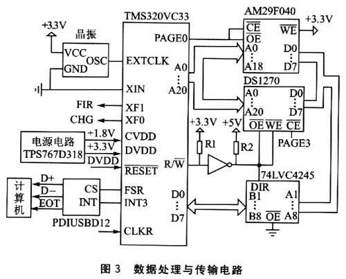 DSl270是一种非易失性的存储器。其输出电压高电平为5 V,但TMS320VC33的I/O口电平为3.3 V,不能承受高电平为5 V的TTL信号。为了使TMS320VC33与DSl270能交换数据,采用74LVC4245实现3.3V和5V的电平转换。74LVC4245同时具有3.3 V和5 V两种供电电源,与DSP相连的I/O脚电平为3.3V,与DS1270相连的I/O脚电平为5 V。