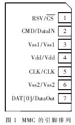 MMC常被设计为一种低成本的数据平台和通讯介质,其存储容量可达2GB。MMC的接口设计非常简单,如图1所示。它采用7针接口,低成本的串行总线,时钟频率可达20MHz。MMC的操作电压为2.7~3.6V,读/写电流也只有23mA和27mA。MMC最小数据传送单位是块,块的大小缺省值定义为512B。MMC的读写模式包括流式模式、多块模式和单块模式等。
