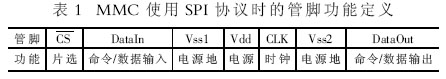 MMC读写接口可在MMC协议和SPI两种通信协议下工作。MMC协议是MMCA协会开发的高性能三线制通信协议,可寻址64 000张MMC多媒体卡,支持顺序读/写操作、单/多数据块读/写操作。表1是MMC使用SPI协议时的管脚定义。