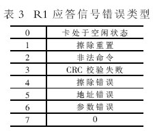 通常,MMC接收到每个命令字后,都会发送一个格式为R1的应答信号(卡状态查询命令字CMD13除外),此应答信号为1字节,最高位为0,其他位为错误标志位,如表3所示。