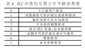 R2格式应答信号的长度为2个字节,用于答复卡状态查询命令字CMD13,首字节同R1,第2字节表示的是错误类型,如表4所示。