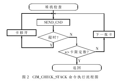 MMC的命令字共分为10个命令组,SPI协议模式支持其中的6个命令组,可以实现MMC系统的基本设定、数据块读、数据块写、擦除、写保护和MMC锁定等功能。以堆栈的检查管理命令CIM_CHECK_STACK为例,它是命令组中基本设定命令之一。它主要通过命令SEND_CSD(CMD9)读取MMC的信息,然后与进入系统堆栈表的接口卡的信息进行对比。如果不是上一张卡,再判定是否超时和超出卡的限定数量,从而确定该卡是否已进入系统。堆栈的检查管理命令流程图如图2所示。