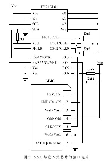 图3是MMC与嵌入式系统芯片PIC16F73B的硬件接口。图中,FM24CL64为缓存芯片,采用Port C的硬件SPI接口对MMC卡进行读写操作。