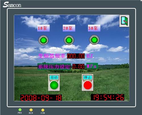 第五步:轻压“启动”,启动PLC设定的程序,开始控制切泵,实现恒压供水。状态监视页面将会显示当前工作状态。