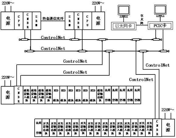 本系统中ControlNet网络总长50m,没有采用中继器,保证信息的实时性。上层计算机中采用1785-PCIC卡连接到ControlNet网络上,下层PLC通过1756-CNBR模块连接至ControlNet网络。为了保证系统的可靠性采用了双网络冗余与双控制器冗余。