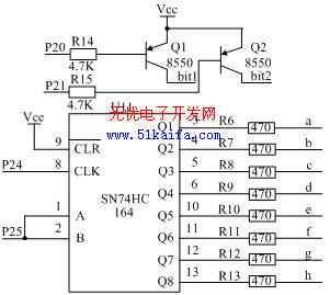 显示模块主要由数码LED显示块和74HC164构成,74HC164为单向8位移位寄存器,可实现串行输入,并行输出。74HC164编程简单,性价比高。选用单片机的两个I/O口完成与显示模块的串行显示连接,其中把单片机的P2.4口作为移位脉冲输出端,P2.5口作为数据输出端。单片机的P2.2口接74HC164的CLK端,对单片机的P2.2口输出的高低电平就是给74HC164数据移位的时钟脉冲,在74HC164获得时钟脉冲的瞬间,如果数据输入端是高电平,则就会有一个1进入到74HC164的内部,如果数据输入端是低电平,则就会有一个0进入其内部,如此循环8次即可将一个8位数据传送至74HC164中。74HC164的输出(并行输出)直接作为数码管的段选控制信号,单片机的P2.0口和P2.1口驱动输出显示的是位选控制信号。显示段码驱动电路如图4所示。