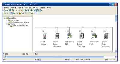 (7)如果上述对话框的进度条一直没有动作,则说明PC和SVPLC通讯连接不正常或PC上有其他程序使用串口。扫描结束后,会提示”扫描网络已完成”。此时,网络中被扫描到的所有节点的图标和设备名称都会显示在软件界面上,在此例中DVPDNET的节点地址为01,如下所示: