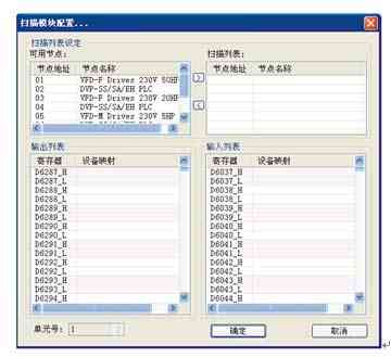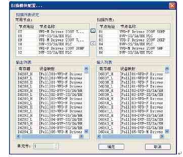(1)双击DNETScanner(节点0)的图标,弹出”主站模块配置…”对话框,可以看到左边的列表里有当前可用节点VFD-FDrives230V50HP,DVP-SS/SA/EHPLC,VFD-FDrives230V20HP,DVP-SS/SA/EHPLC,VFD-MDrives230V5HP,DVP-SS/SA/EHPLC……。右边有一个空的”扫描列表”: