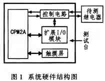 该继电器测试台采用欧姆龙CPM2A型号PLC作为控制单元、ET500系列触摸屏实现人机交互,测试普通继电器、接触器、过流继电器、接地继电器的吸合电压(电流)、释放电压(电流)及电磁(电子)式时间继电器的延时时间等参数。图1给出其硬件结构框图。