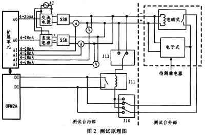 由于测试对象包括直流或交流继电器,电子式或电磁式继电器。电子式又包括共阴或共阳型。因此,该测试台在设计中满足了各种型号、类型继电器的测试需求,其原理如图2所示。系统通过扩展单元的4~20mA模拟量控制信号选择直流或交流电源。