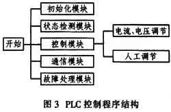 PLC作为控制单元,是整个系统的控制核心。通过接收开关量和模拟量的输入,经处理后输出开关量和模拟量去控制继电器的动作。PLC控制软件主要由初始化模块、状态检测模块、控制模块、通信模块和故障处理模块组成,如图3所示。