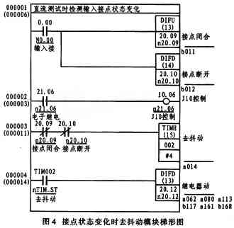 状态模块主要是检测继电器的状态转换。由于触点的物理特性。动触点在吸合接触静触点的瞬间往往会先吸合,再以微小的幅值弹开后再次吸合。针对这样的"抖动",传统测试装置因灵敏度太差,而对测试结果不会造成影响;然而,该测试台因采用PLC检测触点接触,虽然仅仅是不到0.01s,但是PLC会因捕捉到这样的"抖动"而误认为触点吸合了两次或更多次,以致测量无法正常进行。因此,在软件设计中采取了防抖功能,如图4所示。接点不动作时定时器002计时开始,20ms后输出为"1"。当接点闭合或断开瞬间,辅助继电器20.09或20.10接通一个扫描周期,高速计数器002开始计时,计时到后辅助继电器20.12接通一个扫描周期,表示继电器状态已可靠转换。