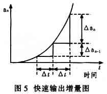 在测试中,当需要对线圈两端升(降)电压(电流)时,为防止电压(电流)上升过快而造成测量误差较大的问题,通过PLC发出0.2s的定时脉冲。在PLC发出每个脉冲的同时对电压进行增减,步长为0.1V。但是有时需要快速增加输出,操作人员可以选择手动输出方式,长按时间2s以上触摸屏上输出增按钮。这种情况下,采用单位输出增量△a为变值来实现。图5所示快速输出增量图。可见,第n-1次输出增量为an-1,第n次输出增量为△an,控制输出增量△a使△an=an-1+1,使每相同时间△t内的输出增量递增,就可实现输出值a的快速增加。人工输出快速减少时其原理一样。