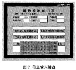 图6所示为测试主控界面。其过程为是先完成测试界面各个窗口、按钮的布局;其次为了使触摸屏和PLC能够正常通信,还要对测试界面的各个子窗口、按钮和输入区域进行相应的设置。设置完成后对其编译,编译通过后就可通过RS232通信电缆将组态信息下载至触摸屏中,这样触摸屏和PLC的通信就建立起来了。然后,运行组态软件,操作人员用手触控这些输入区域时,系统将弹出数字字母键盘,如图7信息输入键盘所示。在该界面可以输入设备名称、规格型号、产品编号、操作员代号、上车号、下车号等信息。根据需要测试的项目触控界面中相应的按钮进入相应的测试操作界面。