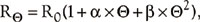 其中R0是0℃时的传感器电阻,α和β是系数,Θ是被测温度。首先替换第二个方程,并做一些变换后,得到: