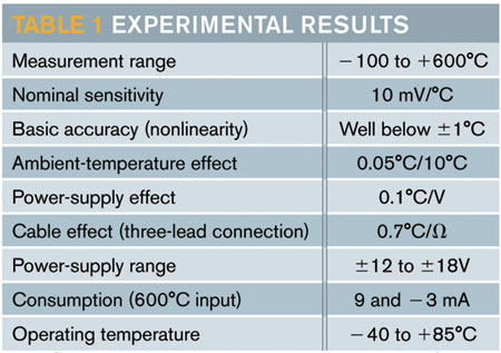 电路所有电阻的公差为0.02%,温度系数为50 ppm/℃。可使用两个微调电位器VR1和VR2来独立调节0读数和范围读数。应该在550℃执行范围调节,以便匹配正误差和负误差的大小。在不超过基本非线性的前提下,还可扩展温度范围,使它不从0℃开始,而是从–100℃开始。通往传感器的三引线连接明显减轻了连接电缆电阻RC对准确度的影响。