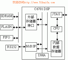 通过C6701的外部存储器接口实现高速外部先入先出(FIFO)存储器与DSP的接口,来保证外部设备FPGA传输数据到DSP进行处理。