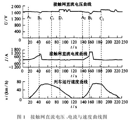 从图1中可以看出,接触网直流电压的最大值约为1800V,最小值约为1500V,则接触网波动约为20%。在列车向接触网要电的时间段A1→B1和A2→B2,接触网直流电压的跌落电压幅度超过200V。在接触网直流电流保持恒定的时间段B1→C1和B2→C2,接触网直流电压也保持了恒定。在列车逐渐停止向接触网要电的时间段C1→D1,接触网直流电压逐渐升高。当列车停止向接触网要电时,接触网直流电压基本保持在1700V左右。在列车制动过程中,车辆最大逆变反馈电压幅度约为150V;在停车期间,逆变引起的电网电压有约50V的波动,这与12相24波头全波整流脉动系数约50V相吻合。