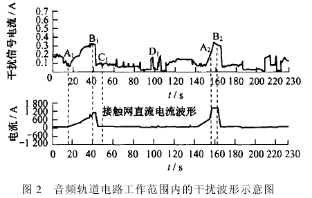 从图2中看到,在列车向接触网要电的时间段A1→B1和A2→B2,随着接触网直流电流的增大,音频轨道电路工作范围内干扰信号的幅度也不断增大;在列车停止向接触网要电的时间段C1→A2,干扰信号仍有一定的幅度,这可能是列车上空调机组起、停造成的干扰。对测得的所有数据进行分析可知,音频轨道电路工作范围内,干扰信号幅度的最大值为300mA,最小值为0,没有超过限值。