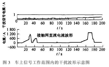 随列车的运行,测得车上信号工作范围内的干扰波形如图3所示。图中最上面的横线表示车上信号正常工作范围内干扰的限值(为1000mA)。由图可知,车上信号正常工作范围内的干扰信号幅度最大值为500mA,没有超过限值。