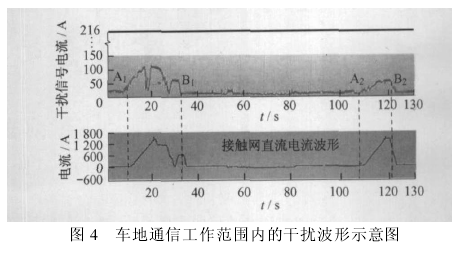 由图4可以看到,在列车向接触网要电的时间段A1→B1和A2→B2,对车地通信信号的干扰波形和接触网直流电流有对应关系,但干扰波形在个别点会有信号畸变。对所有记录的数据进行分析后可知,车地通信信号正常工作范围内的干扰信号幅度最大值为125mA,最小值为0,没有超过限值。