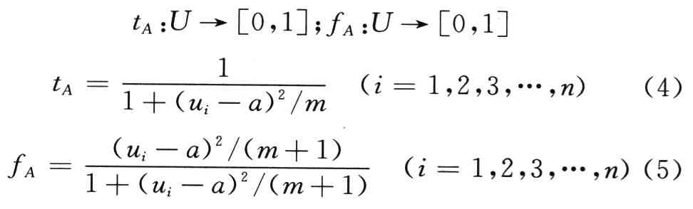 设温度检测点U为论域,U={u1,u2,u3,…,un},n为温度传感器的个数。A是论域上的一个Vague集表示检测温度与恒定温度的距离程度,那么A的真隶属度和假隶属度可由以下函数表示: