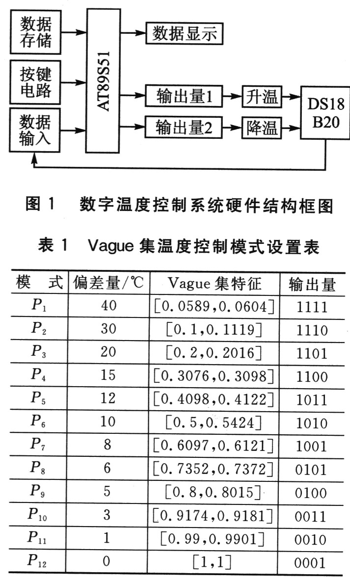 温度控制在工业应用领域占有重要的地位,对温度控制的技术水平高低直接影响到产品的质量。现在对温度控制的技术方法多种多样,有PID控制技术、模糊控制技术等。这些控制技术在实际应用中都表现出各自的技术优势,显示出对温度控制的超凡能力。模糊控制相比传统PID等控制方法,在强时变、大时滞、非线性系统中控制效果有着明显优势。然而模糊控制对隶属函数的选择具有一定的难度,不易确定。自从1993年Gau和Buehrer提出了Vague集理论(Fuzzy集理论的扩展和推广),便在模式识别、人工智能、故障诊断等领域迅速得到应用,并且取得显著成果。Vague集用一个真隶属度和一个假隶属度表示,这比Fuzzy集描述的信息容量要更大些。将Vague集理论应用于温度控制,隶属函数值是一个区间值范围,比Fuzzy集理论的隶属函数更易于确定。Vague集理论的模糊推理精度比Fuzzy集理论要精确得多。本文将Vague集理论应用于温度控制器设计中,发挥Vague集理论的优点,以简化温度控制器的设计过程。选用AT89S51单片机作为核心部件,DSl8B20数字温度传感器作为温度检测器,单片机的软件算法以Vague集理论的模糊推理方法构造实现,设计一种新型的温度控制器,并给出实验结果。