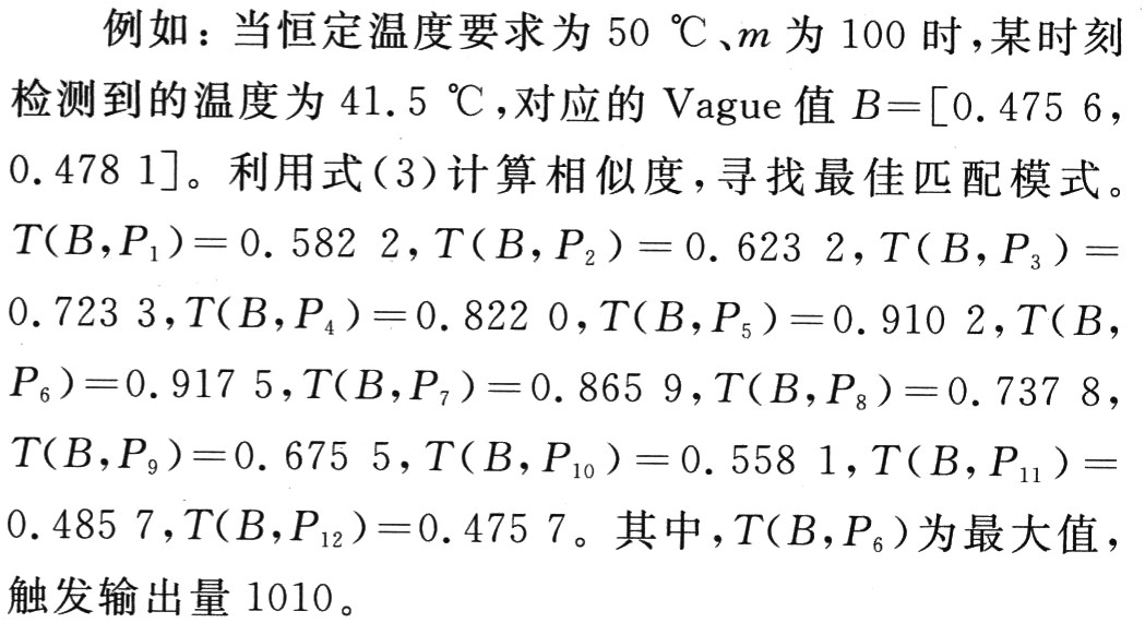 使用Vague集理论设计温度控制器,关键的环节是将测量的温度精确量进行Vague值化,再利用这个Vague值和设定好的控制模式进行相似性度量,寻找匹配控制模式,选择最佳输出量以控制温度的恒定。
