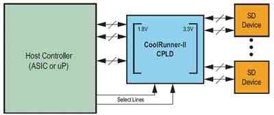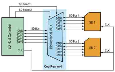 在此类应用中使用CPLD器件,主要目的是为主机控制器提供更多的SD端口,同时在主机器件与SD卡之间实现电平转换和逻辑隔离。图1所示为主机器件是1.8V而 SD器件是3.3V的情形。业界最新CPLD的待机电流微不足道,而动态功耗极低。因此,在系统中集成一个复杂可编程逻辑器件不会显著影响功率预算。