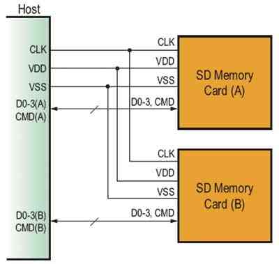 根据SDA(安全数字协会)规范,一条SD总线只能支持一个SD器件。时钟引脚可以共用,但DAT[3:0]和CMD线则必须由每个SD器件独占,如图2所示。