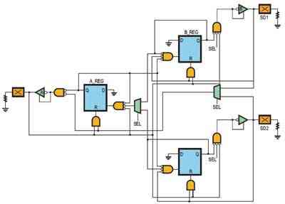 反之,当A从低转为高时,逻辑门B1输出一个低信号,对B输出缓冲器进行三态控制。这样便通过外部上拉电阻强制B变为高。一旦A侧和B侧都变为高,则A_REG和B_REG 复位到0。此过程无限次重复。当SD1要向主机器件传送数据时,情况相反。另外,如果主机器件准备与SD2器件通信,则电路的“选择”信号输入置为逻辑“1”,其事件顺序与上述相似。