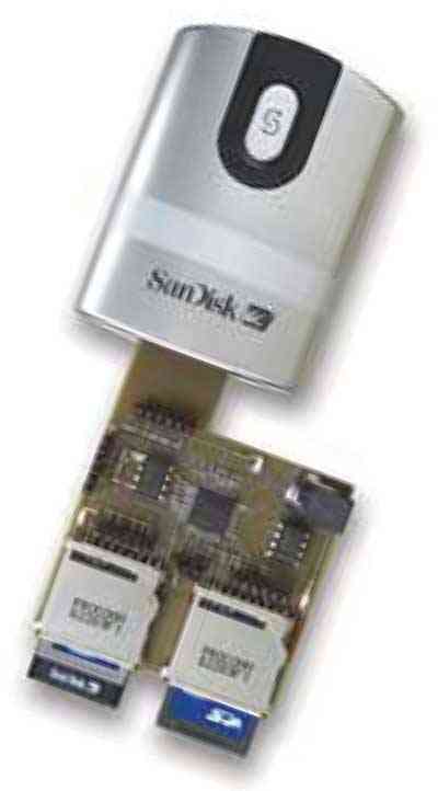 Xilinx制作了一块SD多路复用器演示板,并用该电路板验证了此双向多路复用设计。图 6 所示为该演示板,在中间位置有一个CoolRunner-II XC2C32A CPLD。沿该板的上边缘是两个SD卡插槽。该板的最下部分是依照SD卡的实际尺寸设计的。图7所示为插在USB SD卡读卡器中的演示板。无论是第一张卡还是第二张卡,XC2C32A都能使PC与之完美地通信。
