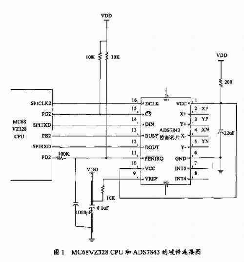本设计中硬件平台微处理器选用Motorola公司的MC68VZ328,它是一款M68k体系的32位低功耗微处理器,采用SoC技术设计,具有典型的嵌入式微处理器的特征;触摸屏选用TI(原为Burr-Brown公司的产品,由于该公司已被TI公司收购,所以下文均用TI公司)公司的ADS7843。在本设计中,CPU与触摸屏以主从方式工作,触摸屏工作于从设备(slave)状态。本设计中硬件电路不同于传统设计,而是充分利用了ADS7843中的BUSY信号线,如图1所示。