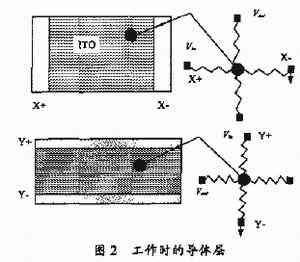 触摸屏工作时,上下导体层相当于电阻网络,如图2所示。当某一层电极加上电压时,会在该网络上形成电压梯度。若有外力使得上下两层在某一点接触,则在电极未加电压的另一层可以测得接触点处的电压,从而知道接触点处的坐标。比如,若在顶层的电极(X+、X-)上加上电压,则在顶层导体层上形成电压梯度;当有外力使得上下两层在某一点接触,在底层就可以测得接触点处的电压,再根据该电压与电极(X+)之间的距离关系,知道该处的X坐标。然后,将电压切换到底层电极(Y+、Y-)上,并在顶层测量接触点处的电压,从而知道Y坐标。对电压在横向和纵向导体层之间的切换以及A/D转换,需要先通过串行外设接口(SPI)往ADS7843发送控制字,转换完成后再通过SPI读出电压转换值。